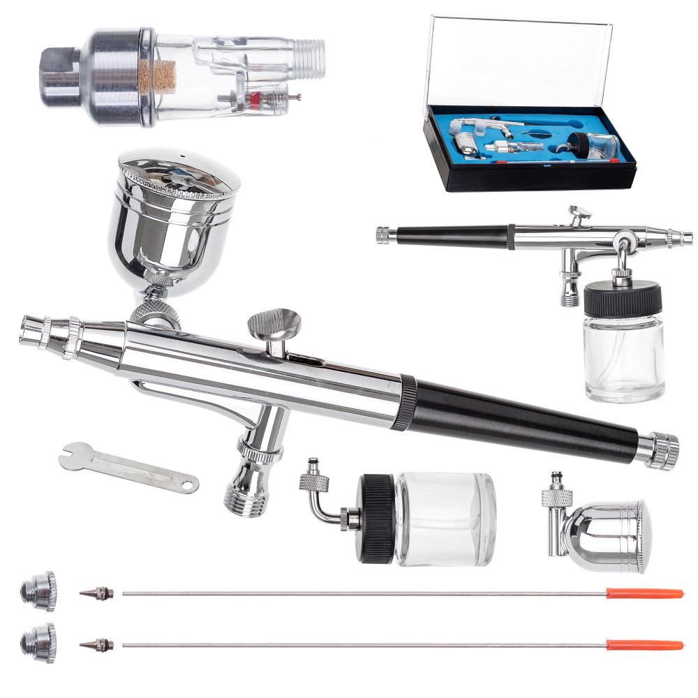 • Versatilitate Multi-Duză: Echipat cu duze interschimbabile de 0,2 mm, 0,3 mm și 0,5 mm, ideal pentru lucrări de detaliu, umbriri sau acoperiri medii.