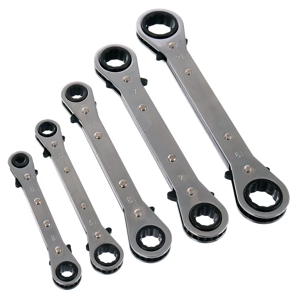Setul de chei inelare duble cu clichet reversibil, CRV, 6-21mm, 5 Buc. reprezintă o investiție inteligentă pentru oricine caută eficiență, durabilitate și versatilitate în uneltele sale. Acesta optimizează procesele de montaj, oferind precizie și confort maxim.