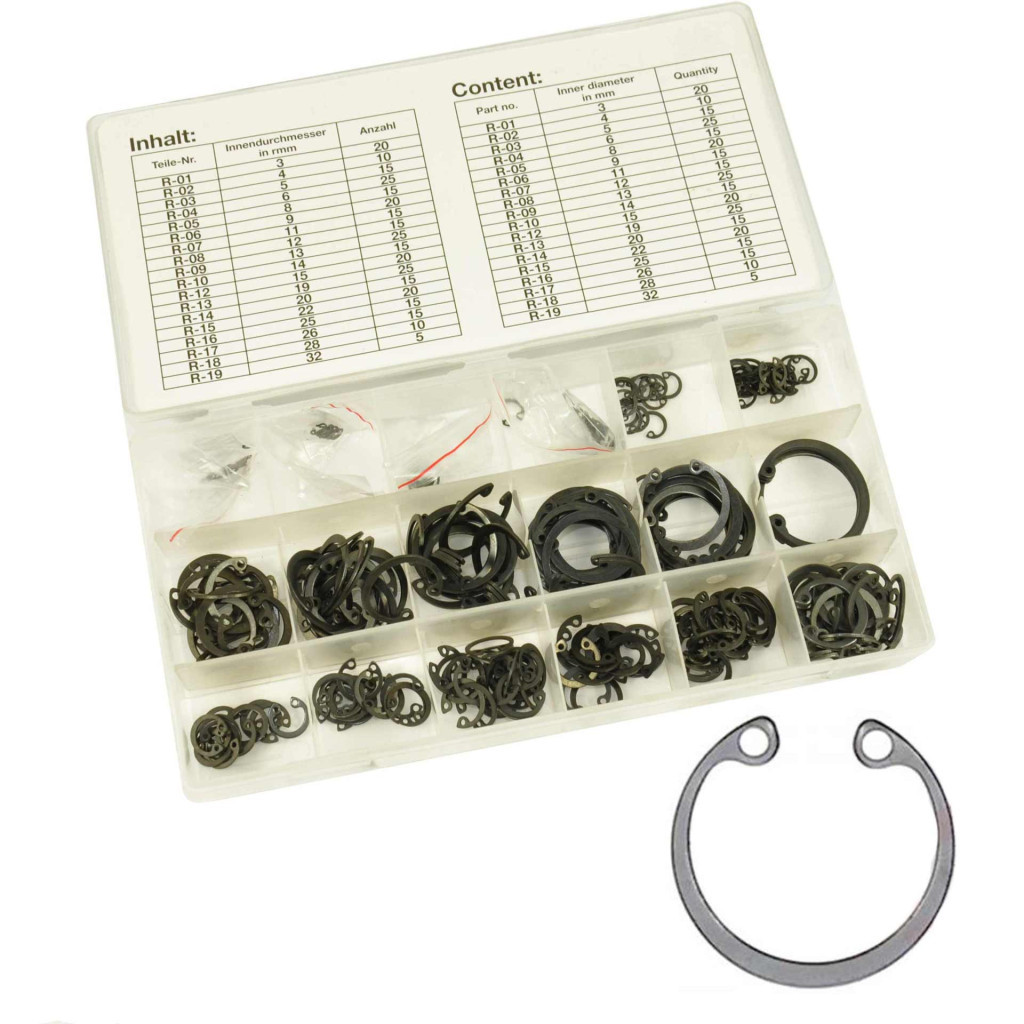 • Set complet cu 300 de inele Seeger interne, într-o selecție variată de dimensiuni, pentru a acoperi o gamă largă de aplicații de fixare.