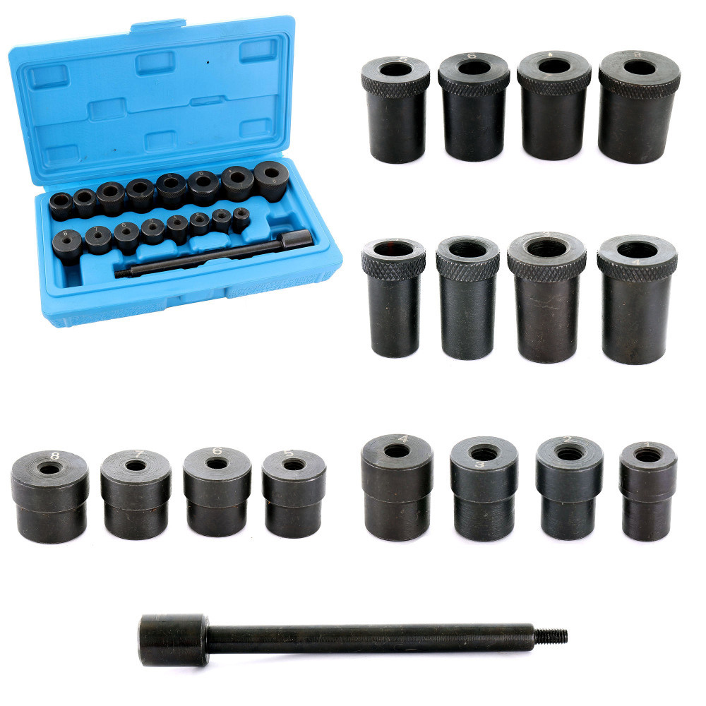• Set complet de 17 piese, incluzând un mâner perforator și 16 inele de centrare conice de diverse dimensiuni.