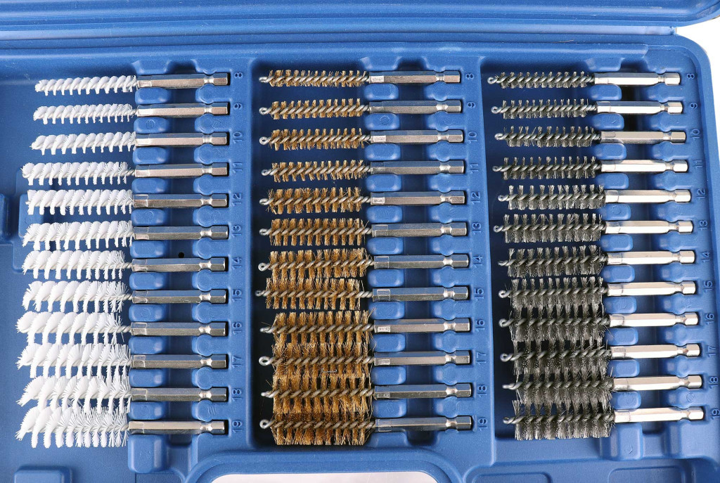 Setul conține perii cu diametre variate, de la Ø 8 mm până la Ø 19 mm, permițând adaptarea la diverse dimensiuni de orificii și suprafețe.