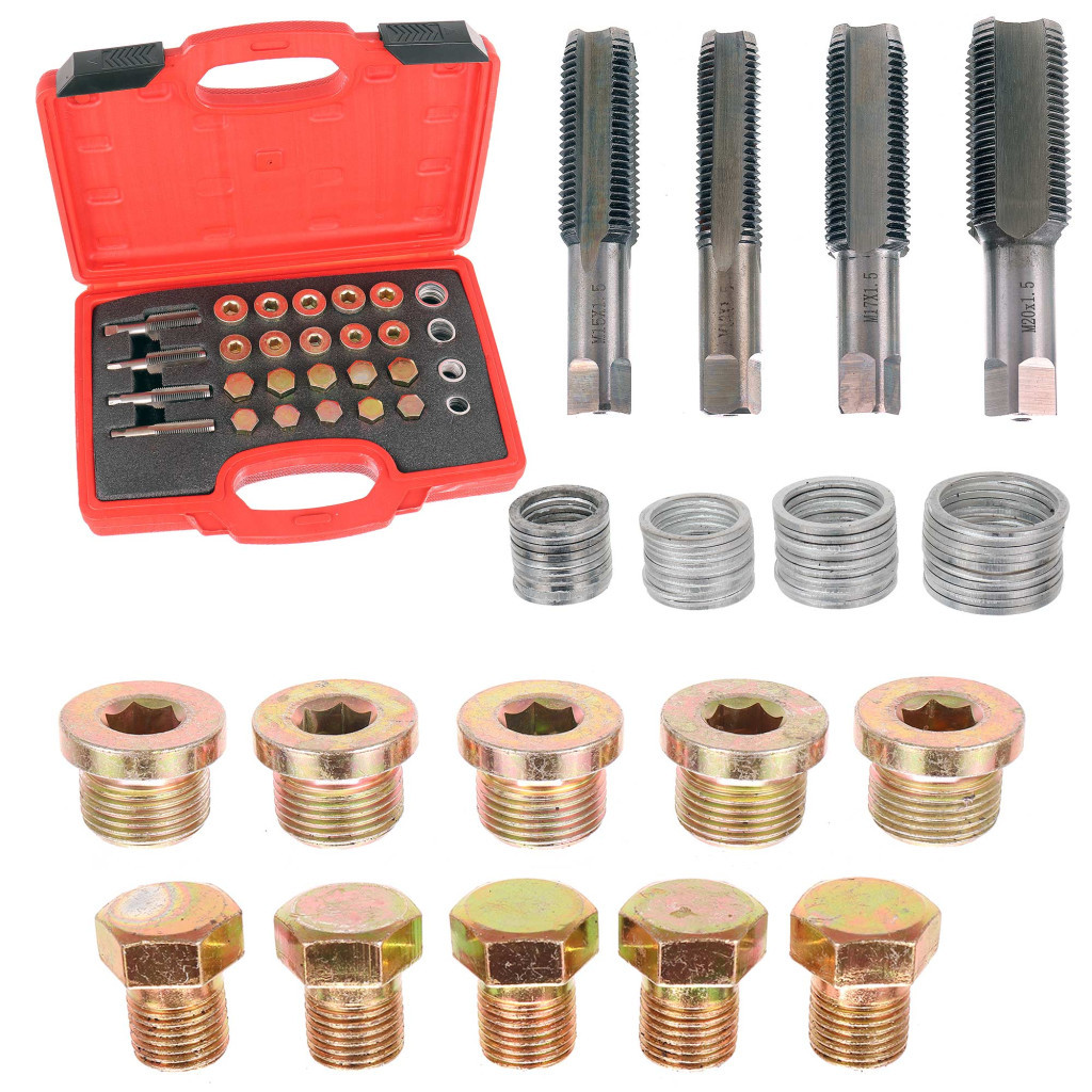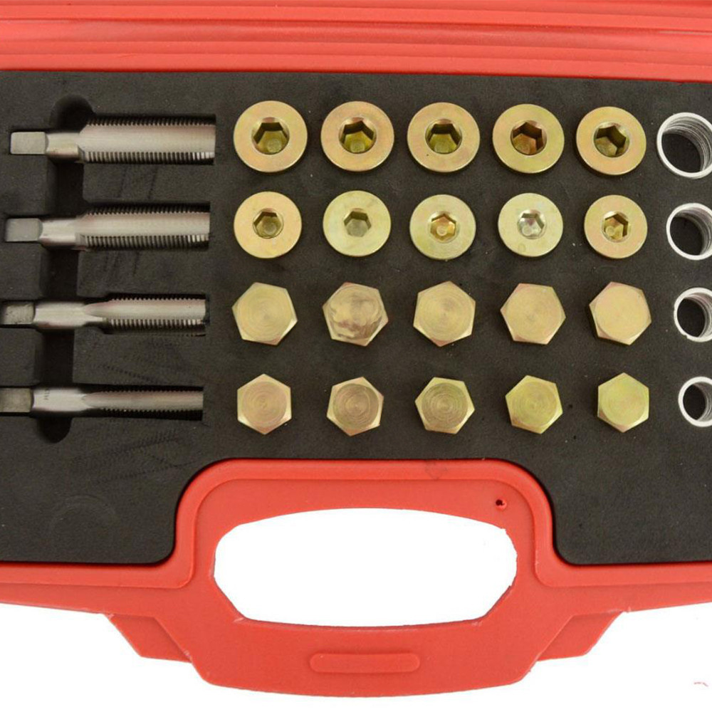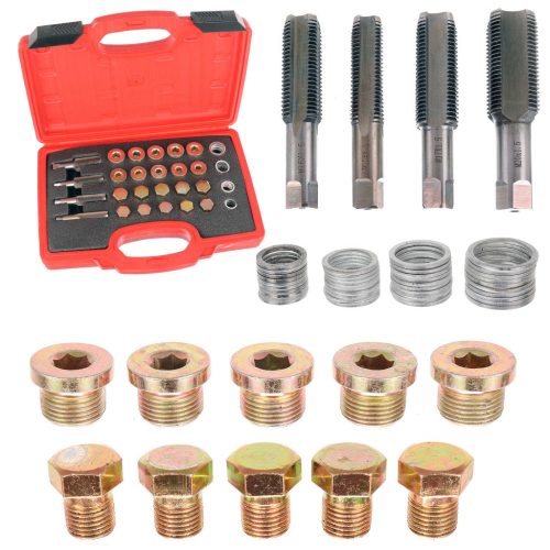 Acest set este ideal pentru reparația filetelor deteriorate ale capacelor de baie de ulei, permițând refacerea unei etanșări sigure.
