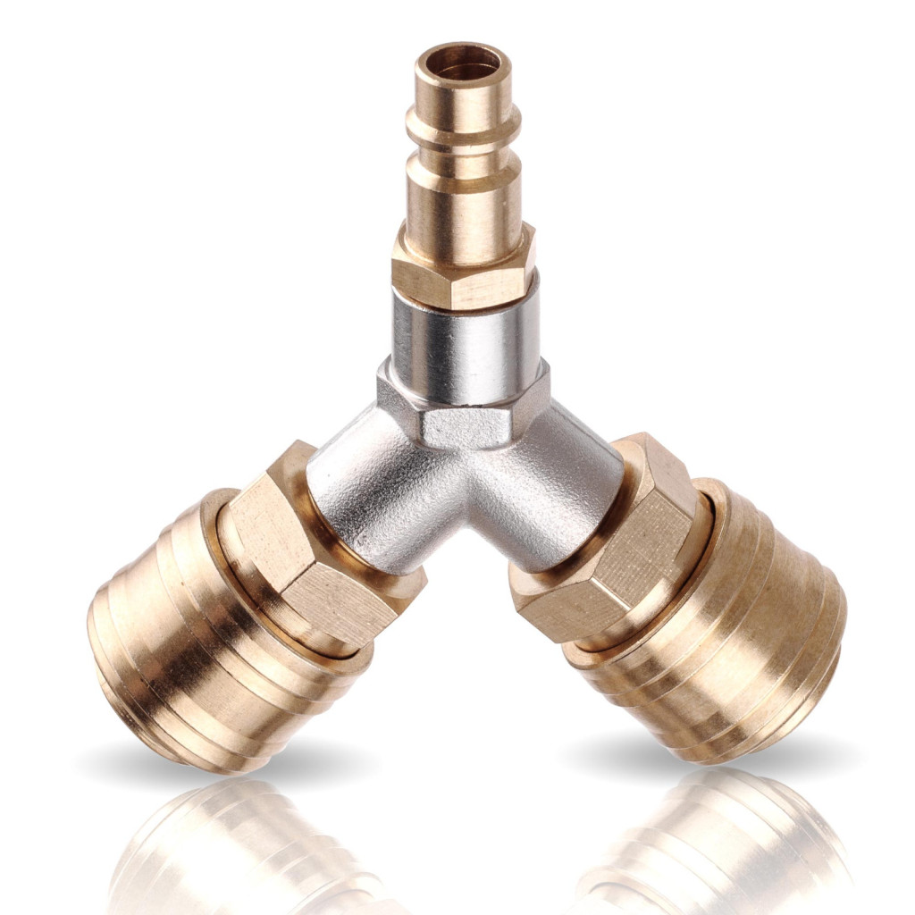 Kitul Conector Rapid Pneumatic cu Fiting T este conceput pentru a permite operarea simultană a două linii de aer dintr-o singură ieșire a compresorului. Este ideal pentru ateliere, service-uri auto și utilizatori casnici, asigurând o conexiune fiabilă și etanșă.