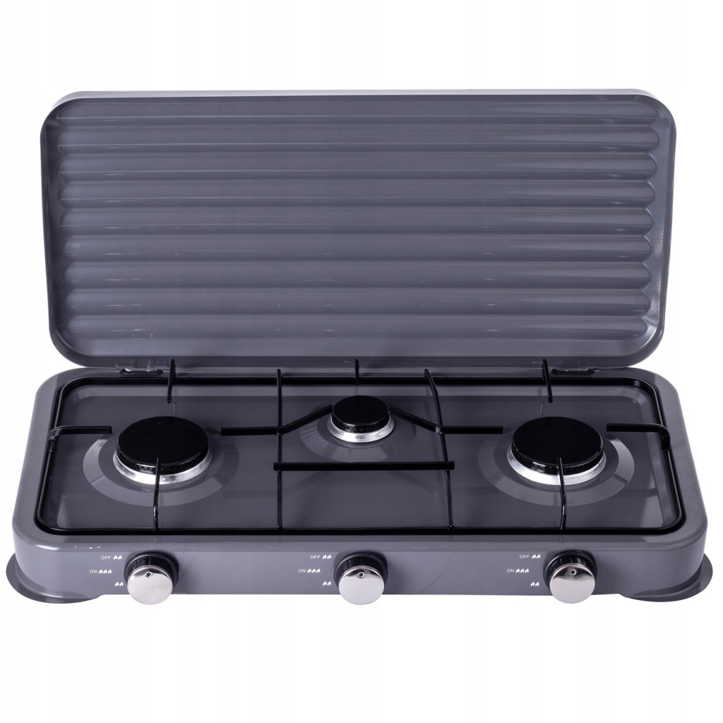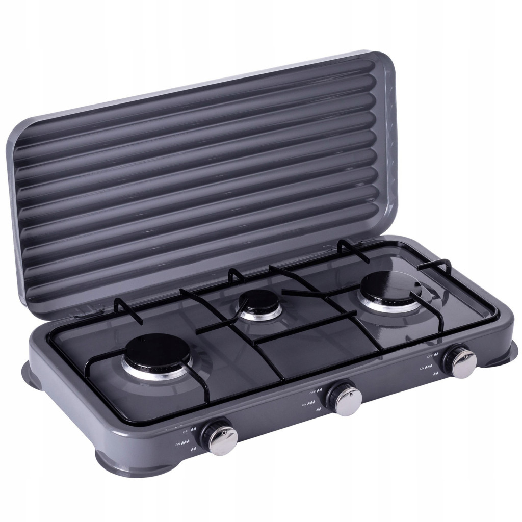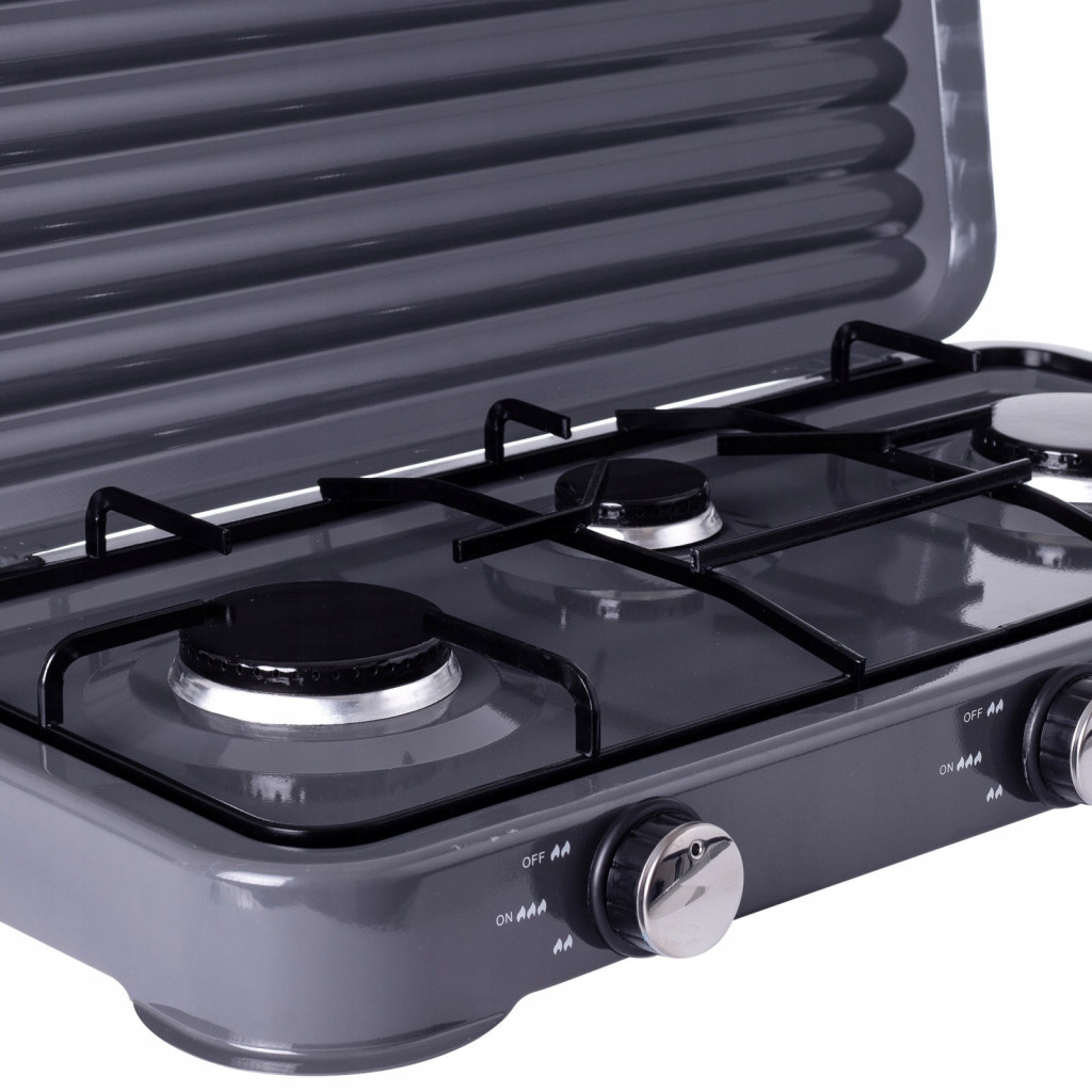 Plita de gaz portabilă cu 3 arzătoare de 5.5 kW este un echipament robust, conceput pentru gătitul eficient în aer liber. Ideală pentru camping, pescuit sau șantiere, oferă o soluție puternică și stabilă de preparare a alimentelor, chiar și în condiții de vânt, grație puterii sale semnificative și a paravântului integrat. Utilizează gaz propan sau butan de la butelii turistice, fiind livrată cu un kit complet de conectare.